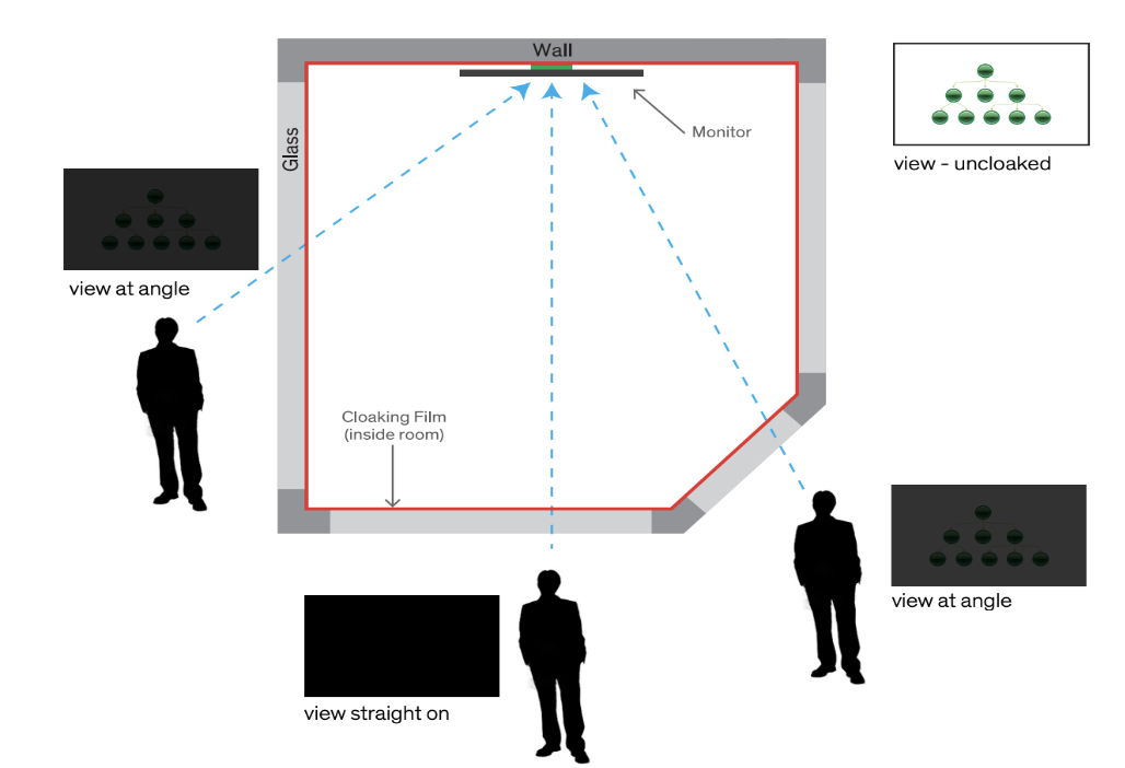Enhver, der kigger ind i rummet udefra, ser kun en sort skærme, mens alle i rummet kan bruge skærmene som normalt og arbejde frit med hensyn til GDPR og diskretion.