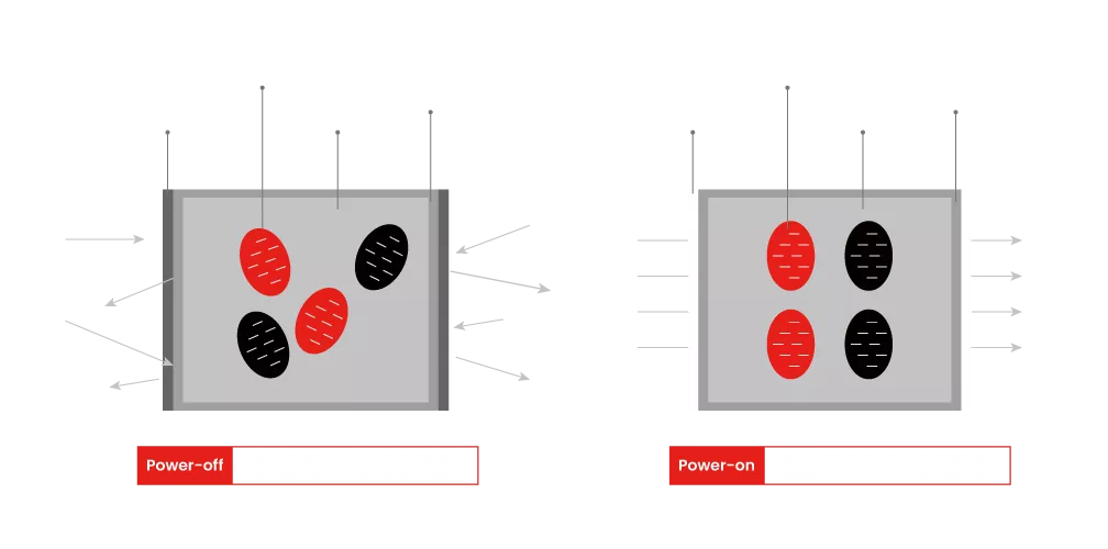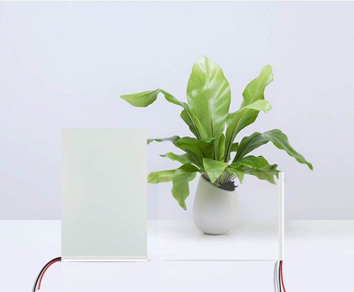 Når strømmen slukkes, vender væskekrystallerne tilbage til deres normale spredte positioner, hvilket gør glasset uigennemsigtigt.